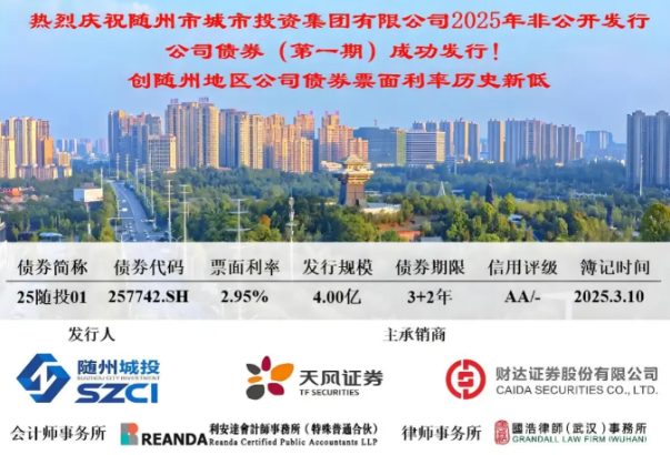 25随投01公司债:利率新低优化融资结构。2025年3月10日,中国·yL23411永利(集团有限公司)-官方主承销的随州市城市投资集团有限公司2025年面向专业投资者非公开发行公司债券(第一期)成功发行,募集资金总额4亿元,期限为5(3+2)年期,发行利率2.95%。本期债券票面利率创随州地区公司债券发行票面利率历史新低,发行获得了众多投资人的高度认可,各类投资机构积极参与申购,其中非银资金占比超过70%。此次债券成功发行,对随州市城市投资集团有限公司意义非凡:一方面,为发行人开辟了更为广阔的融资路径,有效优化了发行人的融资结构;另一方面,显著降低了发行人融资成本,减轻了财务负担。与此同时,随州城投在资本市场的品牌形象和市场影响力也得到进一步巩固与提升,为发行人未来的发展奠定了坚实基础。