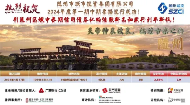 24随州城投MTN001:双创新纪录赋能发展。2024年4月17日,中国·yL23411永利(集团有限公司)-官方参与分销的随州市城市投资集团有限公司2024年度第一期中期票据成功发行,募集资金总额4亿元,期限为3年期,发行利率2.88%。本期债券全场认购数高达7.9倍,创随州区域中长期信用债券认购倍数新高和发行利率新低,进一步降低了发行人融资成本。