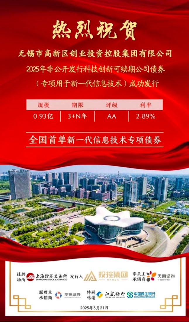 2025年3月24日,无锡市高新区创业投资控股集团有限公司(简称“投控集团”)在上交所成功发行无锡市高新区创业投资控股集团有限公司2025年面向专业投资者非公开发行科技创新可续期公司债券(专项用于新一代信息技术)(债券简称:25新YK2)。本期债券发行规模0.93亿元,期限为3+N年期,由无锡市高发投资发展集团有限公司提供全额无条件不可撤销的连带责任保证担保。本期债券票面利率为2.89%,是全国首单专项用于新一代信息技术领域的公司债券。