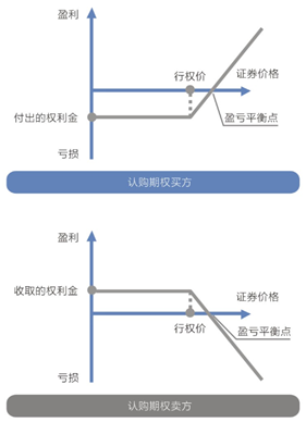 图中可见,当标的证券价格低于行权价时,买方亏损额和卖方盈利额不受影响,均保持为权利金金额不变;标的证券价格上涨高于行权价时,买方亏损缩小,而卖方盈利降低;标的证券价格继续上涨超出行权价加权利金之和(即盈亏平衡点)时,买方扭亏为盈,而卖方则由盈转亏。