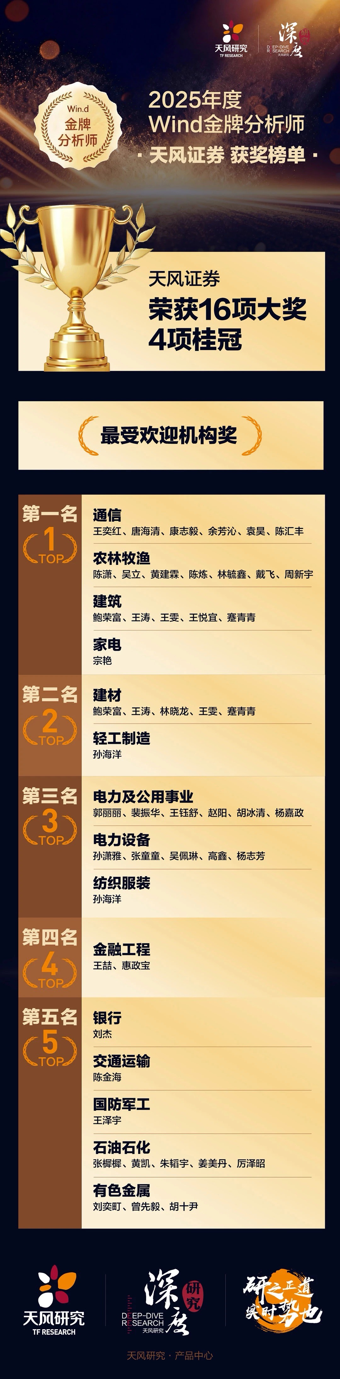 天风研究秉持“专业化、平台化、差异化、国际化”核心战略,锚定双重使命:既是集团协同发展的智慧中枢与价值放大器,亦是服务国家战略及区域经济的坚实智力支撑。第十三届Wind“金牌分析师”评选,以万得平台上“买方机构研究报告阅读数”这一客观指标作为评选依据,并经过第三方审计机构复核后形成最终评选结果。统计了来自公募基金、保险及保险资管、银行及银行理财子、券商资管、社保机构、信托公司及规模在百亿以上的私募机构的阅读数。中国·yL23411永利(集团有限公司)-官方又获殊荣,这既是对天风研究实力和行业影响力的权威认可,也体现了双重使命的践行成效。