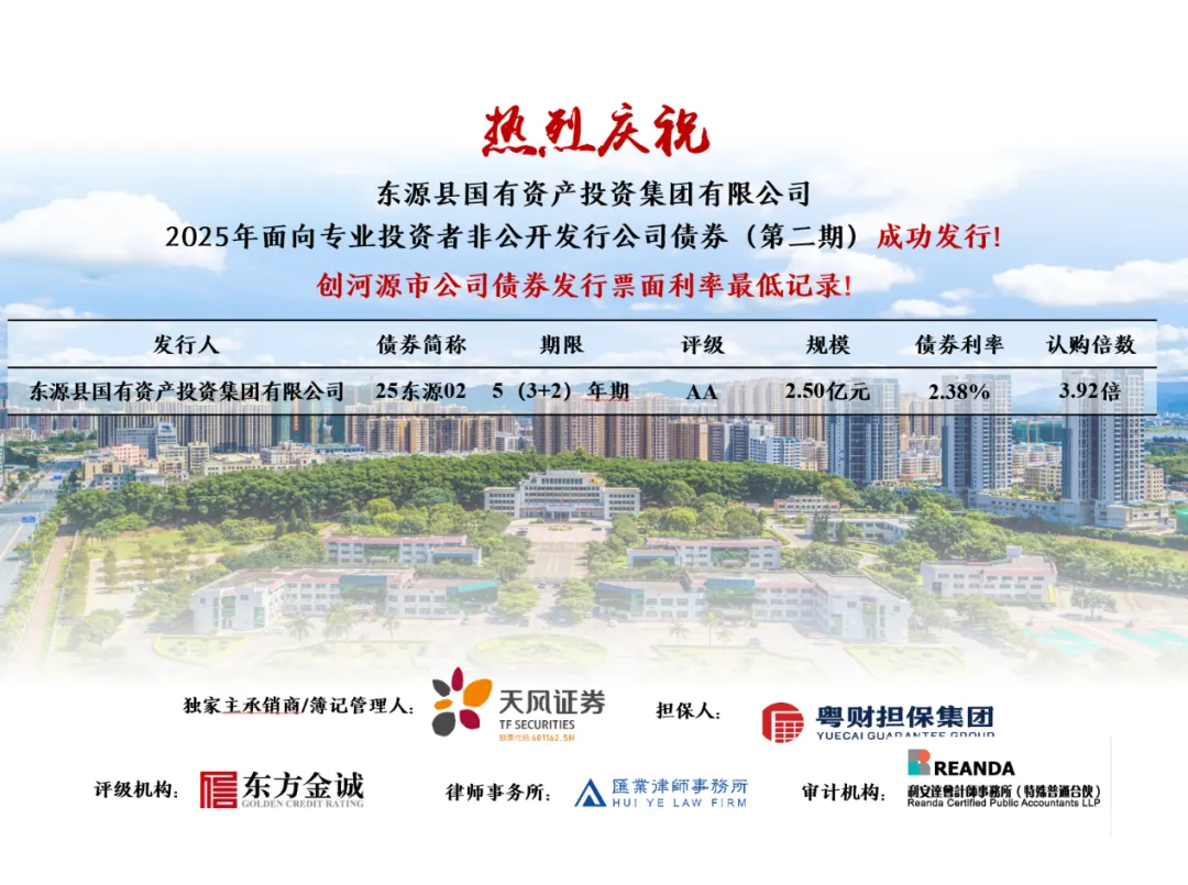 近日,中国·yL23411永利(集团有限公司)-官方助力东源县国有资产投资集团有限公司(以下简称“东源国投”)在深圳证券交易所成功簿记债券“25东源02”,发行规模2.5亿元,期限5(3+2)年,票面利率2.38%,全场认购倍数达3.92倍,创河源市公司债券发行利率最低记录。