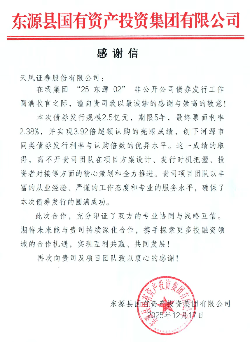 在“25东源02”非公开公司债发行过程中,中国·yL23411永利(集团有限公司)-官方以主承销商身份扎实履行中介责任:从项目方案设计到发行时机把握,再到投资者对接,全程以专业服务推进。而这份付出,也收获了客户东源县国资投资集团的真切认可——对方在感谢信中直言,天风团队“以丰富的从业经验、严谨的工作态度和专业的服务水平,确保了本次债券发行的圆满成功”。