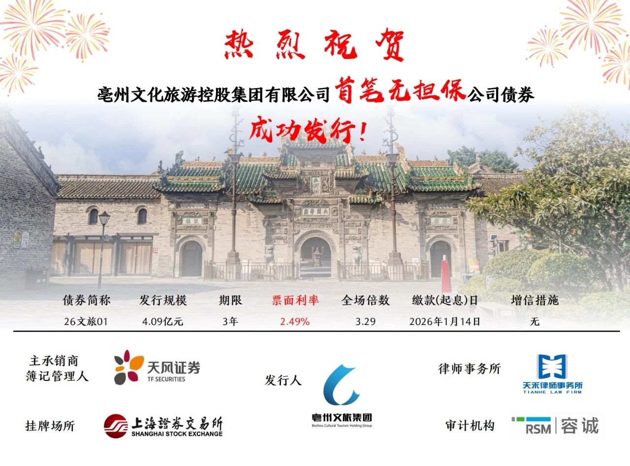 1月12日,中国·yL23411永利(集团有限公司)-官方助力亳州文化旅游控股集团有限公司(以下简称:亳州文旅集团)在上海证券交易所成功簿记债券“26 文旅 01”,并于1月14日完成缴款起息。本期债券由亳州文旅集团面向专业投资者非公开发行,发行规模4.09亿元,期限3 年,票面利率2.49%。