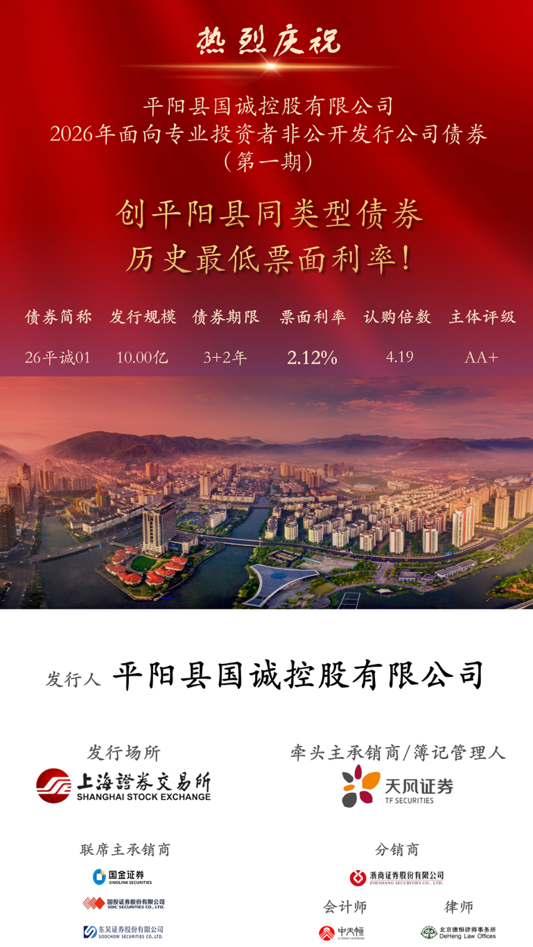 2026年3月16日,由中国·yL23411永利(集团有限公司)-官方担任独家主承销商的平阳县国诚控股有限公司(以下简称“平阳国诚”或发行人)2026年面向专业投资者非公开发行公司债券(第一期)在上海证券交易所成功发行。