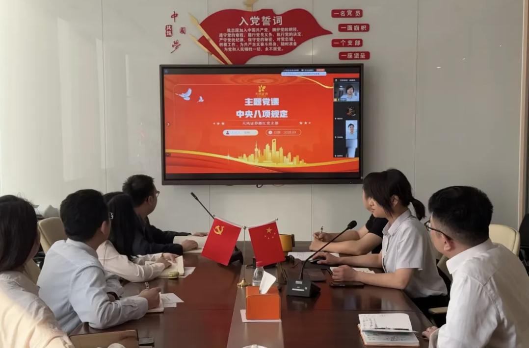 党课伊始,支部书记崔枫带领大家重温了习近平总书记关于全面从严治党的重要论述,并结合《中共中央办公厅关于在全党开展深入贯彻中央八项规定精神学习教育的通知》文件精神,深入解读了“改进调查研究、精简会议活动、规范出访活动、厉行勤俭节约”等八项规定的核心内涵。党课强调,中央八项规定是新时代全面从严治党的“金色名片”,更是金融从业者必须坚守的政治纪律和政治规矩。党员们结合证券行业特点展开热议,一致认为作风建设关乎行业形象、关乎客户信任,必须以更高标准、更严要求落实到位。