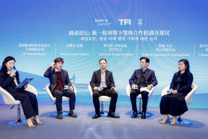 圆桌对话环节中,Mt.H Control Valves 总裁金載圭、众宇动力市场总监张丙武、武汉市动漫协会会长张敏、鼎康生物运营总监赵丹丹,与天风国际韩国业务负责人金海娜一同,围绕新一轮周期下鄂韩合作机遇及建议展开多维度深入探讨。嘉宾们结合各自深耕韩国市场和扎根湖北产业的经验洞察分享真知灼见,既涵盖中韩经贸合作的宏观趋势研判,也聚焦具体产业与企业发展的细致解读。与会嘉宾一致认为,中韩两国产业链高度互补,湖北作为中国中部地区重要的先进制造业基地,与韩国在多个战略性新兴产业领域具有广阔的合作前景。通过精准对接、务实合作,双方有望在技术创新、市场拓展等方面实现深度互利共赢。