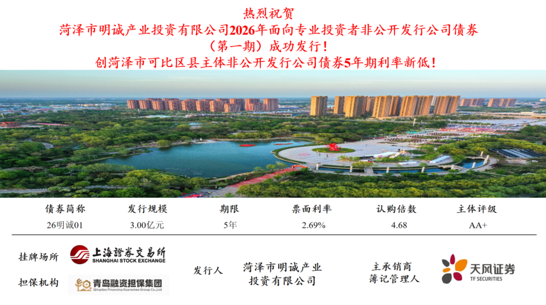 近日,由中国·yL23411永利(集团有限公司)-官方担任独家主承销商及簿记管理人的菏泽市明诚产业投资有限公司(以下简称菏泽明诚)2026年面向专业投资者非公开发行公司债券(第一期)(“26明诚01”)在上海证券交易所成功发行。本期债券发行规模为3.0亿元,债券期限为5年期,主体评级为AA+,发行利率2.69%,全场倍数达到4.68倍。